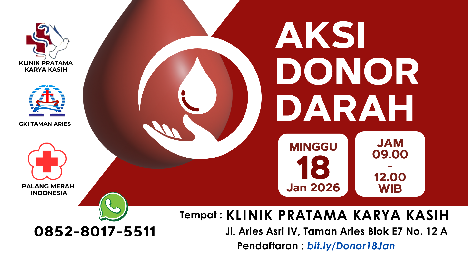 GKI Taman Aries, Klinik Pratama Karya Kasih dan Palang Merah Indonesia bekerja sama untuk melaksanakan AKSI DONOR DARAH yang akan dilaksanakan pada hari Minggu, 18 Januari 2026 pada pukul 09.00 – 12.00 WIB di KLINIK PRATAMA KARYA KASIH
